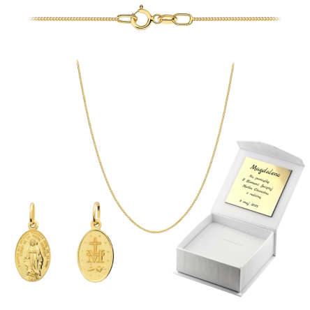 Złoty komplet wykonany ze złota próby 375 o symbolice religijnej, który składa się ze złotego medalika z Matką Boską Niepokalaną oraz złotego łańcuszka o splocie pancerka gładka.