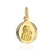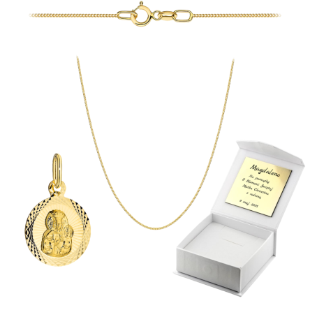 Złoty komplet wykonany ze złota próby 375 o symbolice religijnej, który składa się ze złotego medalika z Matką Boską Częstochowską w diamentowanym kółeczku oraz złotego łańcuszka o splocie pancerka gładka.