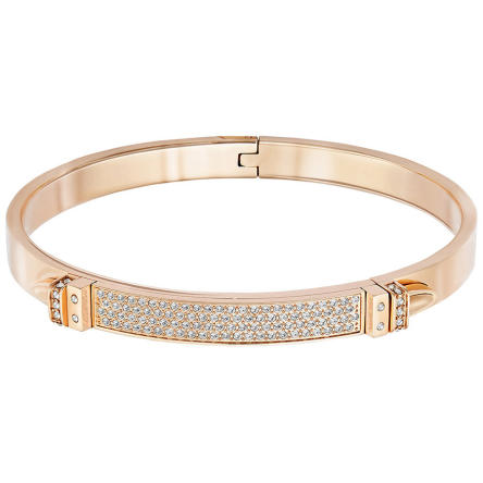 Bransoletka Swarovski wykonana z powłoki PVD w odcieniu różowego złota. Elegancka i modna forma ozdobiona bezbarwną kryształową oprawą pavé i dwiema uroczymi klamerkami, z których jedna służy jako zapięcie.