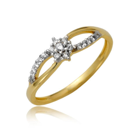 Reprezentatywny pierścionek wykonany został z najwyższej jakości lśniącego żółtego złota próby 333 oraz jednej dużej centralnie usytuowanej cyrkonii, otoczonej mniejszymi cyrkoniami.