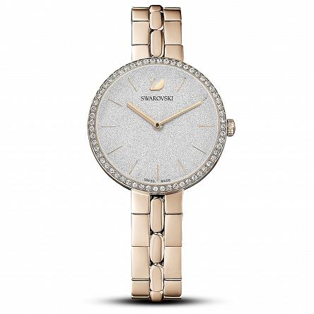 Do kolekcji zegarków marki Swarovski dołącza nowy model Cosmopolitan z tarczą udekorowaną precyzyjnie oszlifowanymi kryształami w kolorze białym. To kolejny przykład kunsztu i precyzji wykonania z czego słynie marka Swarovski. Koperta o wymiarach 32 mm oraz bransoleta o długości 16.5 cm ze stali szlachetnej z powłoką PVD w odcieniu szampańskiego złota prezentują się delikatnie i minimalistycznie. Mechanizm kwarcowy, Swiss Made gwarantuje o wysokiej jakości produktu.