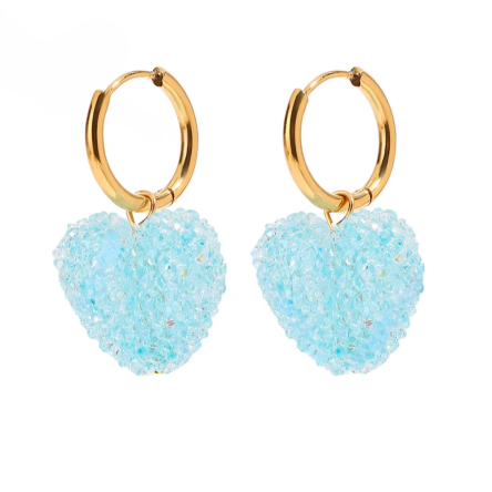 Zawieszone na klasycznych, złotych kółeczkach (wykonanych ze stali szlachetnej) błękitne serduszka połyskują niczym cukrowa posypka. Pokryte drobnymi kamieniami przypominają ulubione słodycze z dzieciństwa – tylko że te możesz nosić bez ograniczeń!