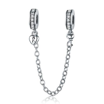 Łańcuszek zabezpieczający wykonany ze srebra próby 0,925. Łańcuszek pasuje do bransoletek Pandora bez gwintów.