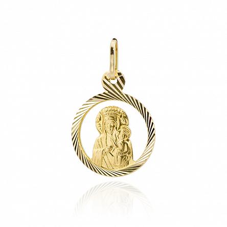 Precyzyjnie wykonany złoty medalik próby 585 z wizerunkiem Matki Boskiej z Dzieciątkiem Jezus na diamentowanym okręgu. Złoty medalik to pamiątka chrztu, pierwszej komunii, bierzmowania, ważnego jubileuszu, czy rocznicy.