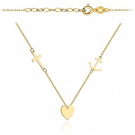 Precyzyjnie wykonany złoty naszyjnik próby 585. Łańcuszek ankier został ozdobiony symbolicznie: krzyżykiem, sercem i kotwicą. Naszyjnik będzie modnym uzupełnieniem codziennej stylizacji i świetnie sprawdzi się jako prezent dla osoby bliskiej Naszemu sercu.