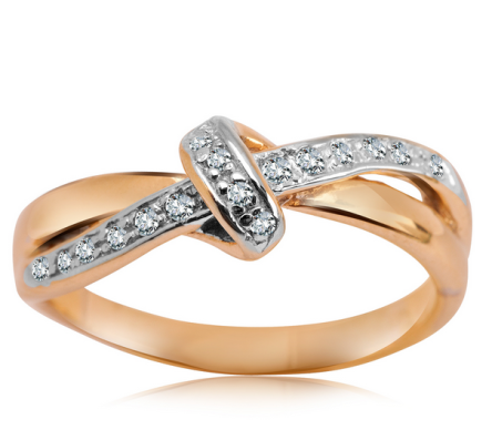 Pierścionek wykonany z dwukolorowego złota próby 585. Pierścionek został ozdobiony cyrkoniami.