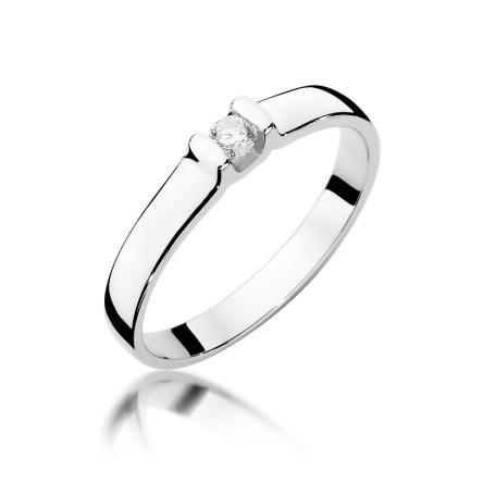 Pierścionek wykonany jest z najwyższej jakości białego złota próby 585 oraz ozdobiony jest kamieniem szlachetnym o szlifie brylantowym usytuowanym w misternej oprawie. Masa brylantu 0,09 ct, czystość SI2, barwa H.