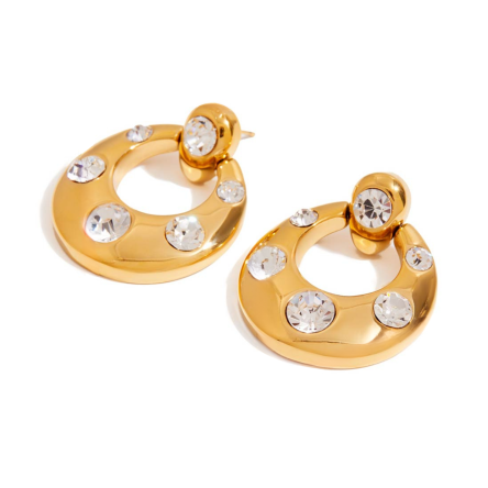 Wyjątkowe kolczyki wykonane z wysokiej jakości stali szlachetnej w eleganckim, złotym odcieniu. Ozdobione lśniącymi białymi kamieniami jubilerskimi, które dodają im niepowtarzalnego uroku i subtelnego blasku. Idealne dla osób, które cenią stylowe dodatki o wyrafinowanej estetyce. Te kolczyki to doskonały wybór na co dzień, jak i na specjalne okazje, podkreślające indywidualność i klasę.