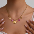 Ten naszyjnik to jak cichy spacer po ukwieconym ogrodzie o poranku. Delikatny łańcuszek ze stali szlachetnej pokrytej 18-karatowym złotem zdobi sześć uroczych kwiatuszków. Razem tworzą subtelną kompozycję, która zachwyca swoją lekkością i finezją.