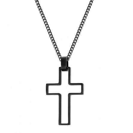 Elegancki, ażurowy krzyż wykonany ze stali szlachetnej w kolorze czarnym. Krzyż został zawieszony na łańcuszku o długości 70 cm. Czarny kolor uzyskano za pomocą metody PVD.