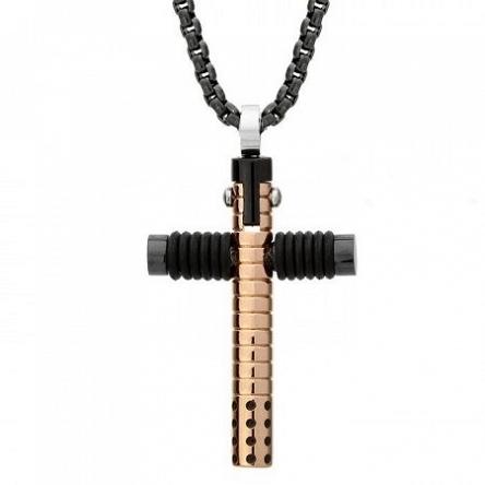 Elegancki, klasyczny krzyż wykonany ze stali szlachetnej w kolorze czarnym oraz różowego złota. Krzyż został zawieszony na łańcuszku o długości 55 cm. Kolor uzyskano za pomocą metody PVD.