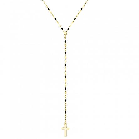 Naszyjnik typu różaniec wykonany ze stali szlachetnej ozdobiony subtelnym krzyżykiem oraz czarnymi kuleczkami z emalii jubilerskiej. Kolor uzyskano za pomocą metody PVD.