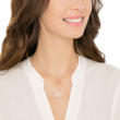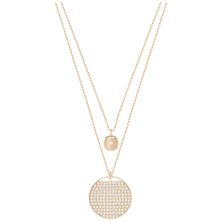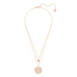 Warstwowy wisiorek wyposażony w dwa metadliony, wykonane z metalu pokrytego powłoką w odcieniu różowego złota, z czego jeden – większy został wypełniony jasnymi kryształami pavé.