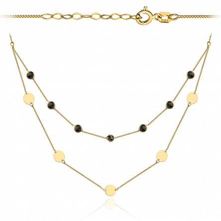 Precyzyjnie wykonany złoty naszyjnik próby 585. Podwójny łańcuszek ankier został ozdobiony kółeczkami i syntetycznymi onyksami. Naszyjnik będzie modnym uzupełnieniem codziennej stylizacji i świetnie sprawdzi się jako prezent dla osoby bliskiej Naszemu sercu.