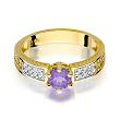 Efektowny pierścionek wykonany z lśniącego żółtego złota próby 585, udekorowany ametystem o masie 0,50 ct oraz brylantami o łącznej masie 0,08 ct – usytuowanymi na szynie!