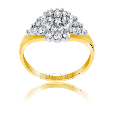 Pierścionek wykonany z dwukolorowego złota próby 0,585. Pierścionek został ozdobiony cyrkoniami.