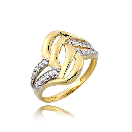 Pierścionek wykonany z dwukolorowego złota próby 585. Pierścionek ozdobiony został cyrkoniami.