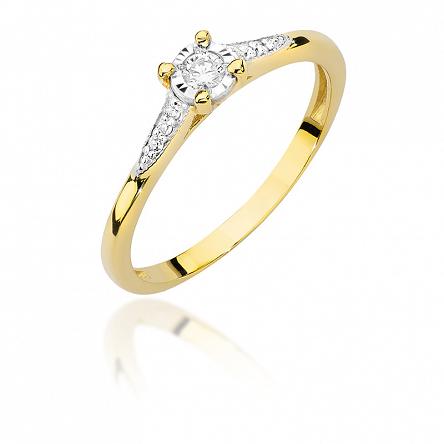Pierścionek wykonany został z zółtego złota próby 0,585 i ozdobiony jest brylantami o łącznej masie 0,11 ct, czystości SI oraz barwie H, kamienie posiadają Certyfikat Autentyczności.