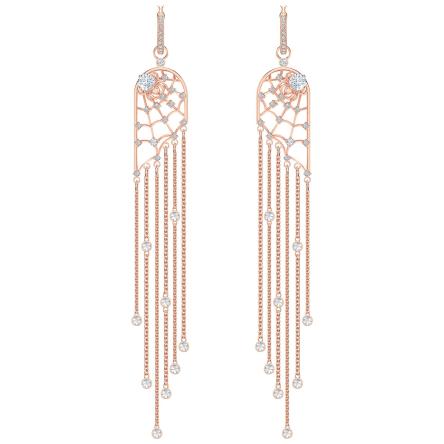 Efektowne kolczyki Swarovski w kolorze różowego złota. Zainspirowany pięknem zamarzniętych kropli wody na pajęczynie. Płynna konstrukcja ma filigranową wstęgę ozdobioną przezroczystym kryształem i kaskadę frędzli łańcuchowych. Ponadczasowa elegancja, szczególnie w połączeniu z pasującymi elementami z tej linii.