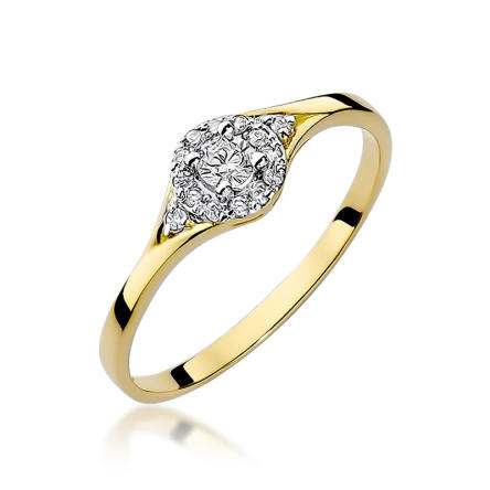 Pierścionek wykonany został z żółtego złota próby 585, który w subtelny sposób podkreśla blask brylantów, którymi został ozdobiony (łączna masa brylantów 0,17 ct, czystość SI2 oraz barwa H).
