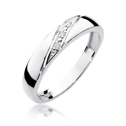 Subtelny pierścionek wykonany został z białego złota próby 0,585 oraz trzech brylantów o łącznej masie 0,02 ct, czystości SI2 oraz barwie H, usytuowanych obok siebie.