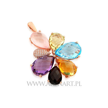 Ekskluzywna zawieszka z diamnetami i kamieniami kolorowymi. Diamenty o masie 0,15ct czystości SI i barwie H, kamienie kolorowe o masie 19,86ct(Ametyst, Cytryn, Topaz niebieski, Kwarc żółty, Kwarc dymny). Kamienie posiadają certyfikat autentyczności. Złoto dwu kolorowe próby 585.
