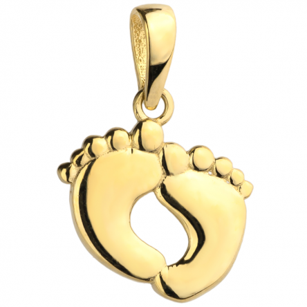 Precyzyjnie wykonana złota zawieszka próby 585 w kształcie stópek. Doskonała jako upominek dla przyszłej mamy, prezent urodzinowy, czy pamiątka ważnej uroczystości.